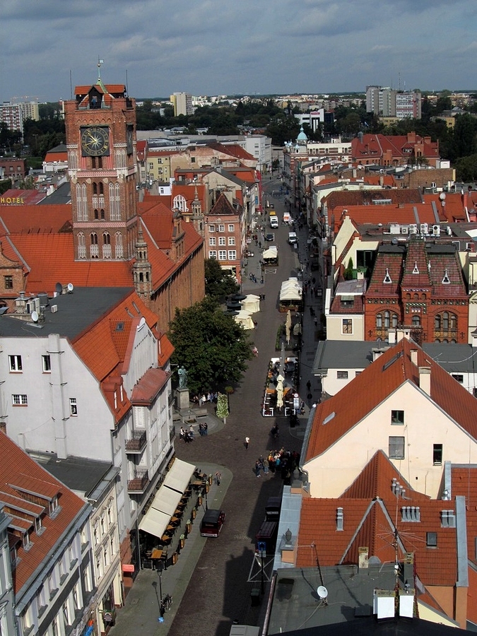 Ta w dole ulica to ul. Żeglarska w Toruniu. W XVII wieku, nazywana Drogą Królewską albo Traktem Królewskim, czyli Via Regia, a przemierzał nią orszak królów polskich, witany przez miejskie władze, by zagościć w komnatach Ratusza.