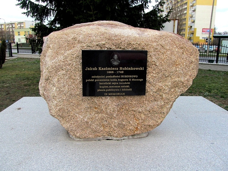 Ten pamiątkowy kamień (na zdjęciu) ustawiono na przykościelnym terenie kościoła pw. Matki Bożej Królowej Polski w pobliżu głównej bramy. Upamiętnia Jakuba Kazimierza Rubinkowskiego, żyjącego w latach 1668  1749. W młodym wieku znalazł się on na dworze króla Jana III Sobieskiego, a że na królu wywarł bardzo dobre wrażenie, więc miał do młodego dworzanina wielkie zaufanie i powierzył mu funkcje komisarza celnego. W 1696 roku przyjechał do Torunia i tu rozpoczął karierę kupca. Wykorzystując swoje rozliczne kontakty handlowe, rozpoczął interesy między Toruniem, Gdańskiem a Polską (handlował m. in. alkoholem, solą i zbożami), często łamiąc prawo i doprowadzając do nadużyć. Nowy król August II Sas również miał do niego zaufanie i 11 lipca 1715 obsadził go na stanowisku poczmistrza królewskiego w Toruniu (funkcję tę pełnił przez 34 lata). W 1724 roku, po tzw. tumulcie toruńskim, objął dodatkowo stanowisko katolickiego rajcy toruńskiego (był jednym z czterech pierwszych w historii miasta) i stał się obrońcą praw katolików w tym mieście, skupiając wokół siebie środowisko katolickie. Na terenie jego dawnego folwarku w Toruniu, w latach siedemdziesiątych XX wieku, zbudowano jedno z największych w mieście osiedli i nazwano je RUBINKOWO na jego cześć.