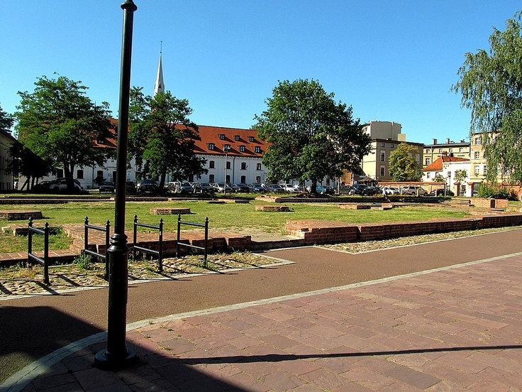 Niegdyś w tym miejscu wznosił się gotycki kościół św. Mikołaja oraz klasztor dominikanów  oba obiekty zbudowane zostały w XIV wieku, a rozebrane przez Prusaków w pierwszej połowie XIX wieku. Była to w tamtych czasach największa budowla toruńskiego Nowego Miasta. Pozostałości zespołu klasztornego zachowały się jednak do dziś i obecnie są wyeksponowane w formie zarysu ruin przyziemia. W północnej części placu, dopiero w XIX wieku, na potrzeby Twierdzy Toruń, wzniesiono budynki: piekarnię i tak zwany Nowy Arsenał (widoczny na zdjęciu w głębi).