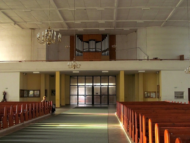 Nad głównym wyjściem z kościoła pw. Świętego Maksymiliana Kolbego w Toruniu znajduje się chór, a po jego środku organy (piszczałki widoczne na zdjęciu).