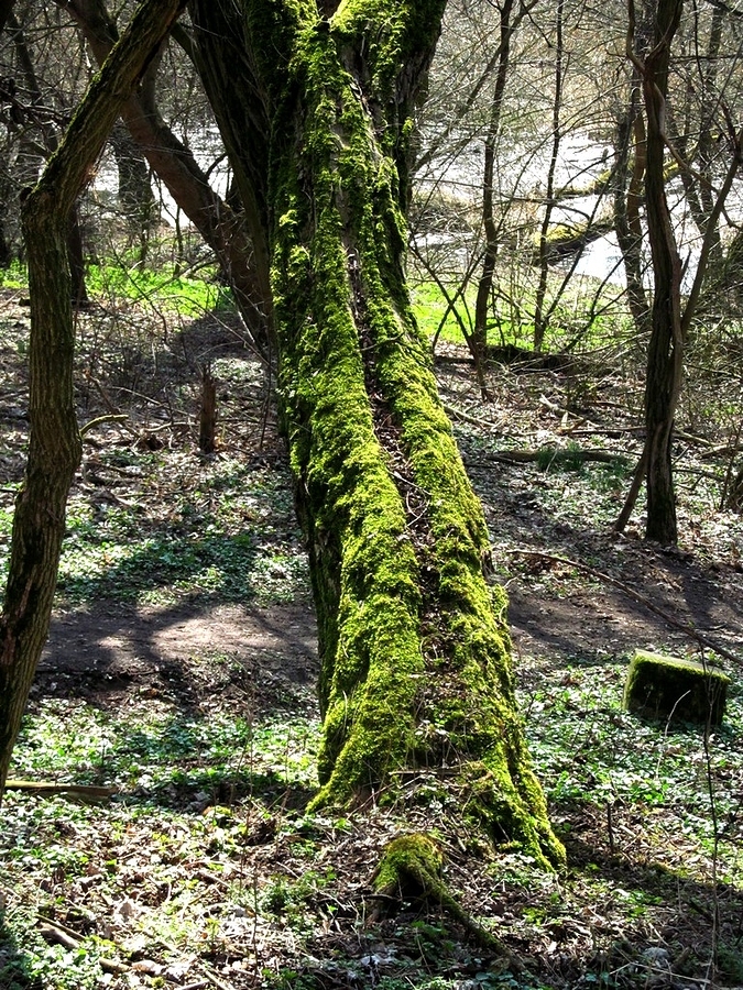 Tylko niektóre pnie drzew rosnących w pobliży koryta Wisły w Toruniu pokryły się gęstą warstwą mchu.
