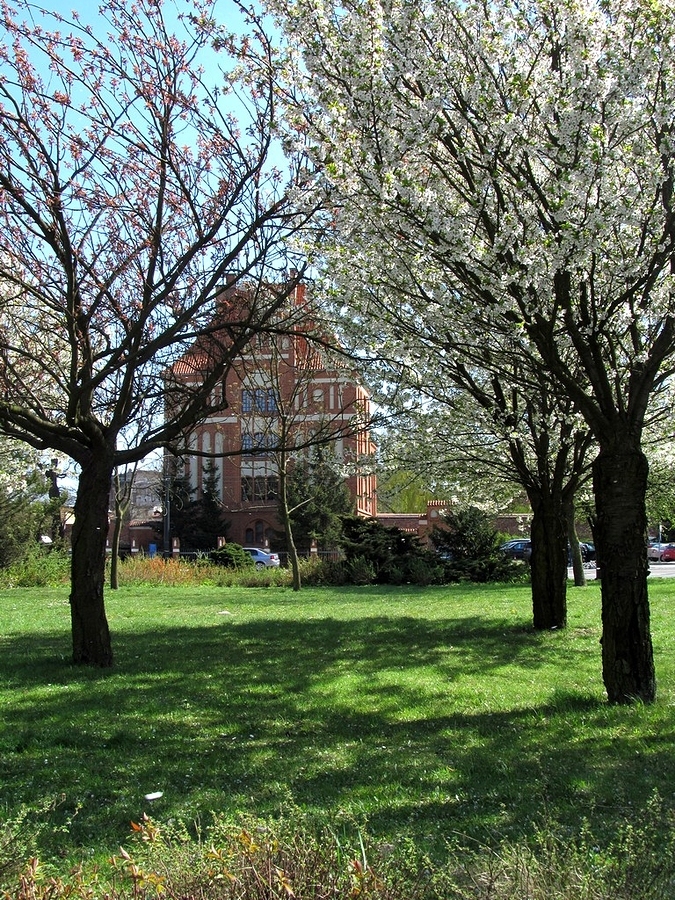 Chociaż kwitnące drzewa wiosną nieco przysłaniają stojący w głębi obiekt, od 1904 r., kiedy został wybudowany, było w nim powiatowe więzienie. Dziś w jego pomieszczeniach mieszczą się wydziały Urzędu Miejskiego w Toruniu.