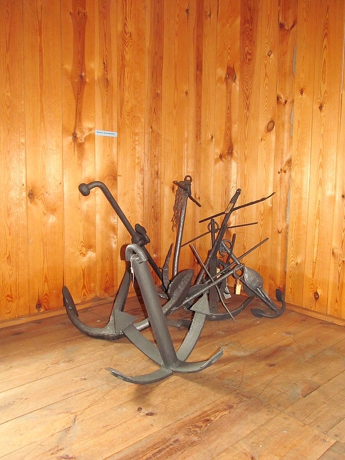 W takie dwuramienne kotwice wyposażone był kiedyś barki pływające po rzece. Te na zdjęciu stoją w jednym z pomieszczeń barki, która stoi w Parku Etnograficznym w Kaszczorku w Toruniu.