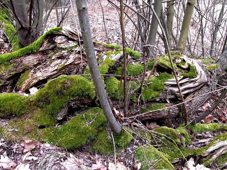 W lesie, nawet powalone kłody i wystające z ziemi korzenie drzew, nie są wstanie uwolnić się od mchu.
