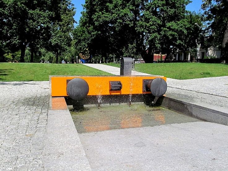 Tę fontannę (na zdjęciu) stworzono po rewitalizacji małego parku przed dworcem kolejowym w Aleksandrowie Kujawskim. Park wówczas otrzymał imię Jana Pawła II. Ale jest tu więcej elementów związanych z kolejnictwem.