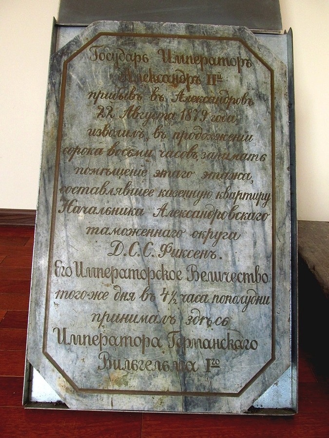 Ta tablica (na zdjęciu) w języku rosyjskim, upamiętniająca spotkanie dwóch cesarzy: Rosji i Niemiec, jakie odbyło się w Aleksandrowie pogranicznym (obecnie Aleksandrowie Kujawskim) w drugiej połowie XIX wieku, wisiała swego czasu na budynku dworcowym. Teraz można ją oglądać jedynie w Aleksandrowskiej Izbie Historycznej, mieszczącej się na parterze tego zabytkowego dworca. Jej treść w tłumaczeniu na język polski brzmi następująco: Jego Cesarska Wysokość Aleksander II przybyły do Aleksandrowa 22 sierpnia 1879 r roku był łaskaw przez 48 godzin zajmować pomieszczenia tego piętra będącego mieszkaniem służbowym Naczelnika Aleksandrowskiego Okręgu Celnego D.S.S. Fiksena. Jego Cesarska Mość tego dnia o godzinie 4.30 po południu przyjął tutaj Cesarza Niemieckiego Wilhelma I.