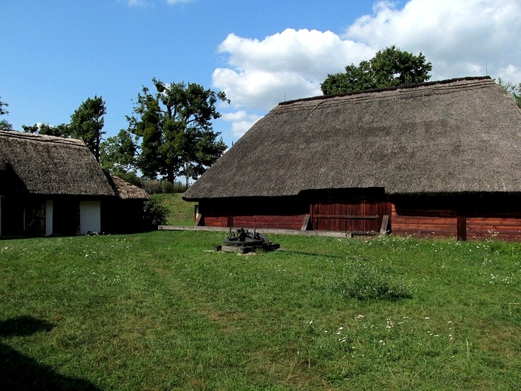 Pośrodku zagrody kujawskiej w Parku Etnograficznym w Toruniu stoi kierat, na wprost chałupy (niewidocznej na zdjęciu) stodoła, a z boku budynek gospodarczym, w którym m.in. trzymano zwierzęta hodowlane.