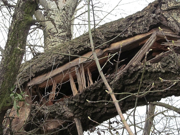 Ten sporej wielkości konar po złamaniu na skutek wichury, teraz na przechodniów zęby szczerzy.