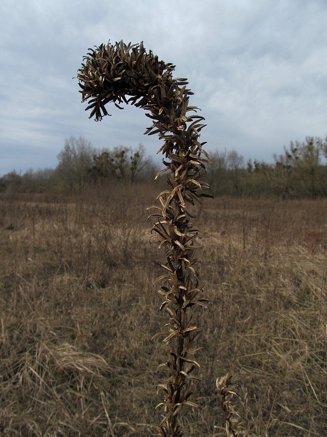 Ta zasuszona roślina przypominająca laskę, stoi samotnie na opustoszałym polu w pobliżu koryta Wisły w Toruniu.