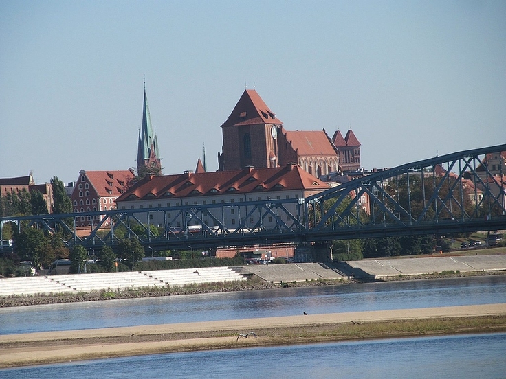 Na zdjęciu: Na pierwszym planie most drogowy im. Józefa Piłsudskiego. Tuż za nim obecnie Hotel BULWAR, ale kiedyś były tu koszary Marynarki Wojennej. Za nim widać kościół pw. św. Janów z zegarem flisaczym, a strzelista wieża obok to kościół garnizonowy pw. św. Katarzyny, natomiast po jego lewej stronie oryginalny spichlerz, którego okna przypominają swoim wyglądem wypełnione worki.