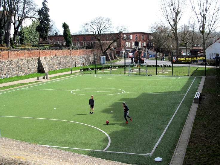 To boisko (na zdjęciu) wkomponowane zostało w średniowieczną fosę zbudowaną przez Krzyżaków. Widoczny w głębi zdjęcia obiekt z czerwonej cegły to XIX-wieczny magazyn pontonowy.