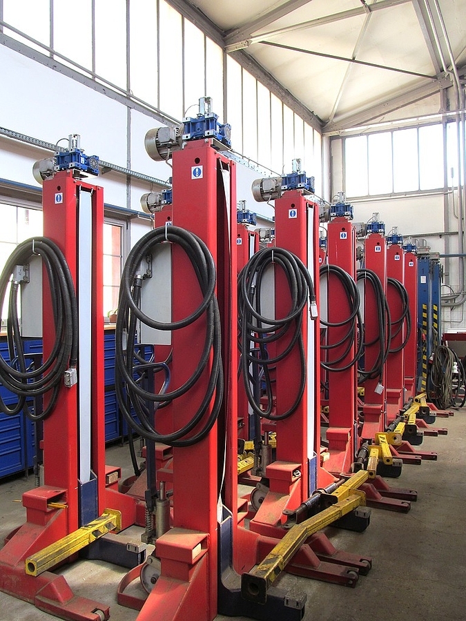 W toruńskiej Zajezdni Tramwajowej przeprowadzane są zarówno kapitalne remonty, jak i bieżące naprawy wagonów tramwajowych. Czasami w tym celu trzeba podnieść wagon pojazdu na pewną wysokość. Do tego służą podnośniki nowoczesnej generacji (na zdjęciu).
