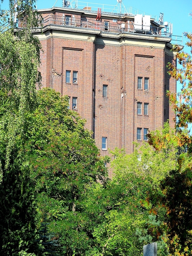Do 2000 r. ta (na zdjęciu) wieża ciśnień należała do Polskich Kolei Państwowych. Wybudowana została w latach 1941 1943 przez więźniów wojennych, głównie brytyjskich, przetrzymywanych w fortach XI, XII i XIII. Po wojnie zaadaptowana została na mieszkania i tak jest po dzień dzisiejszy.