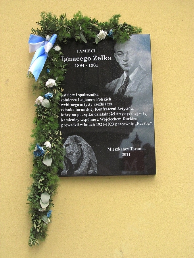 Toruński artysta-rzeźbiarz  Ignacy Zelek, choć nie urodził się w Toruniu, dał się poznać nie tylko torunianom, dzięki wielu swoim pracom w obiektach użyteczności publicznej, ale i sakralnej oraz dzieł w kolekcji osób prywatnych. Już jako dorosły człowiek przeprowadził się do Torunia po odzyskaniu przez miasto niepodległości i tu wspólnie z Wojciechem Durkiem (także rzeźbiarzem) założył pracownię pod nazwą Rzeźba w kamienicy przy ul. Sukienniczej 2 (róg ul. św. Katarzyny). Przed kilkoma dniami upamiętniono Ignacego Zelka odsłonięciem na tej kamienicy tablicę pamiątkową (na zdjęciu).