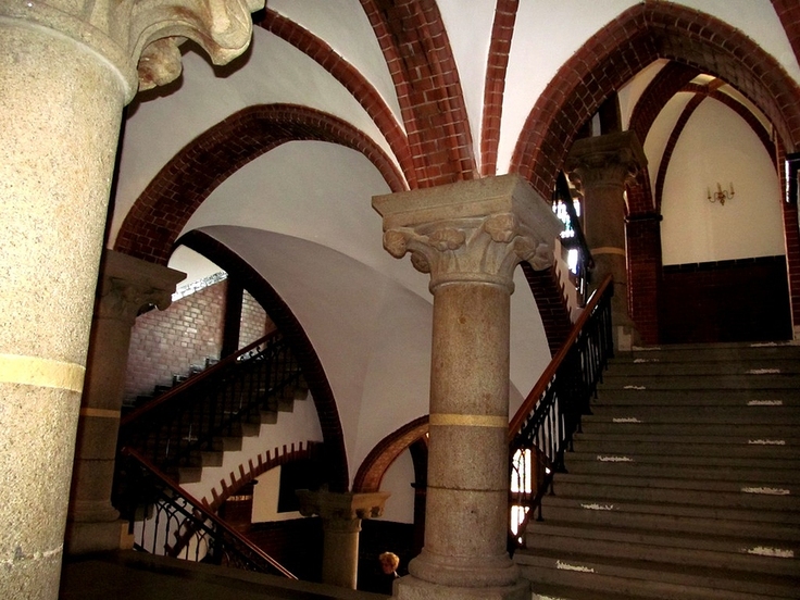 Dziś jest to Collegium Maius Uniwersytetu Mikołaja Kopernika, ale ten neogotycki budynek wzniesiony został w latach 1905  1906 w miejscu średniowiecznych fortyfikacji miejskich według projektu architektonicznego miejskiego radcy budowla  G. Colley\'a, przeznaczony był na siedzibę Gewerbeschule, czyli Szkoły Rzemieślniczej. W okresie międzywojnia gmach był siedzibą Urzędu Wojewódzkiego Pomorskiego (Toruń był wtedy stolicą województwa), a w czasie II wojny światowej został zajęty przez niemiecką policję, która w podziemiach obiektu urządziła ciężki areszt. Na zdjęciu: Klatka schodowa wewnątrz obiektu.