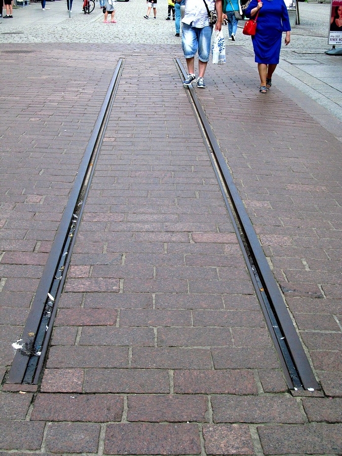 Ten maleńki fragment szyn (na zdjęciu) ułożonych na ulicy Królowej Jadwigi w Toruniu, tuż przed wjazdem na Rynek Nowomiejski, mają przypominać o tym, że kilkadziesiąt lat temu, właśnie tędy (a w tym miejscu był przystanek w kierunku Jakubskiego Przedmieścia), po reprezentacyjnej ulicy miasta, jeździł tramwaj linii nr 1. Trzeba jednak wiedzieć, że pierwsze składy tramwajowe, wówczas jeszcze zaprzężone w konie, od 1891 r. kursowały z Bydgoskiego Przedmieścia ulicami Kopernika, Ducha św., Szeroką i Królowej Jadwigi do Dworca Toruń Miasto. W 1936 r. torowisko przeniesiono z ul. Kopernika na ul. Różaną i poprowadzono pod Łukiem Cezara. Z toruńskiej starówki tramwaje jednak zniknęły  stało się to dopiero w 1970 r.