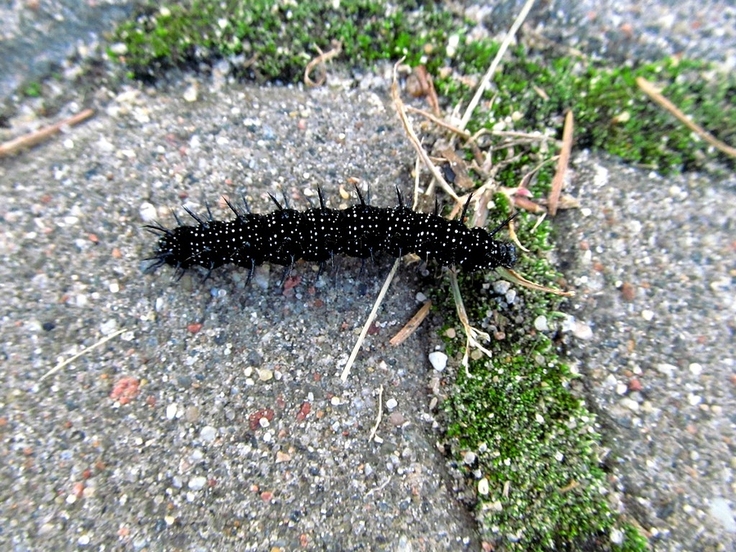 Ta gąsienica spacerowała sobie po ulicy, ale spodobała mi się i dlatego ją sfotografowałem. Te długie kolce na grzbiecie oraz białe małe kropeczki świadczą o tym, że gąsienica jest już dojrzała i za kilka tygodni zmieni się w poczwarkę; w kolejnej przemianie stanie się imago pięknym motylem nazywanym RUSAŁKĄ PAWIKIEM.
