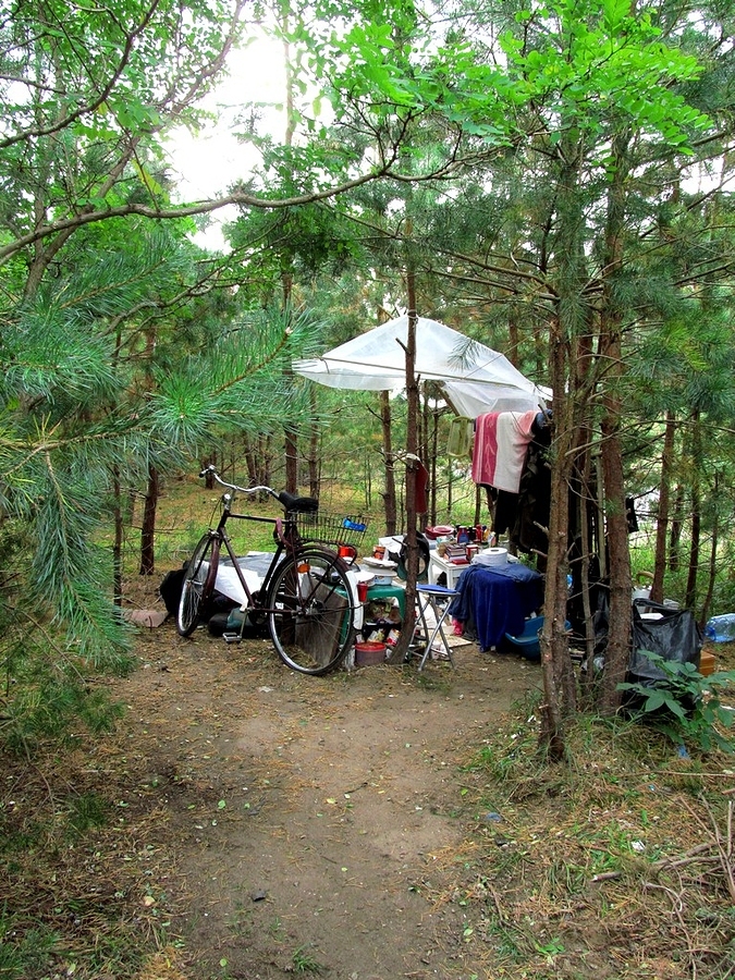 Spacerując po lesie dostrzegłem w zaroślach coś w rodzaju szałasu, niewątpliwie zbudował sobie jakiś bezdomny. Akurat nikogo w nim nie było, być może wybrał się właśnie do sklepu, a może na poszukiwanie złomu lub makulatury, aby zarobić trochę pieniędzy, żeby przeżyć kolejny dzień? Latem, to może da się w takim \"domu\" mieszkać, ale późną jesienią czy zimą... Bezdomność  to jednak indywidualna decyzja każdego człowieka, bo przecież są ośrodki dla takich ludzi, więc czemu wielu z nich nie chce korzystać?