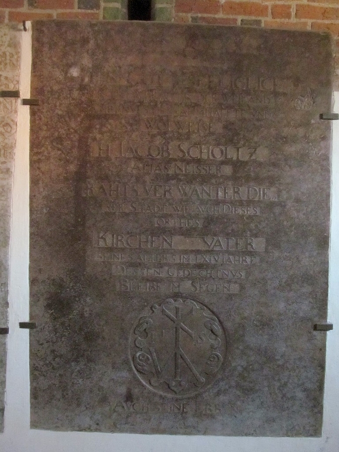 Ta czerwona tablica (na zdjęciu), zamocowana na ścianie w kruchcie kościoła św. Jakuba w Toruniu (w bocznym wejściu do świątyni) to płyta nagrobna Jacoba Scholtza vel. Neisser, który zmarł w 1625 r. Był on toruńskim browarnikiem, a także rajcą i członkiem miejscowej rady kościelnej; należał do jednego z najbogatszych toruńskich rodów patrycjuszowskich.