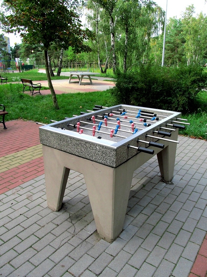 Spółdzielnia Mieszkaniowa NA SKARPIE w Toruniu zadbała o swoich mieszkańców, głównie dzieci, ale młodzież i ludzie dorośli także mogą skorzystać z wielu zabawek i sprzętu, jaki ustawiony jest na osiedlu. Ten futbol (na zdjęciu) stoi w osiedlowym parku; w głębi zdjęcia widać stół do ping-ponga.