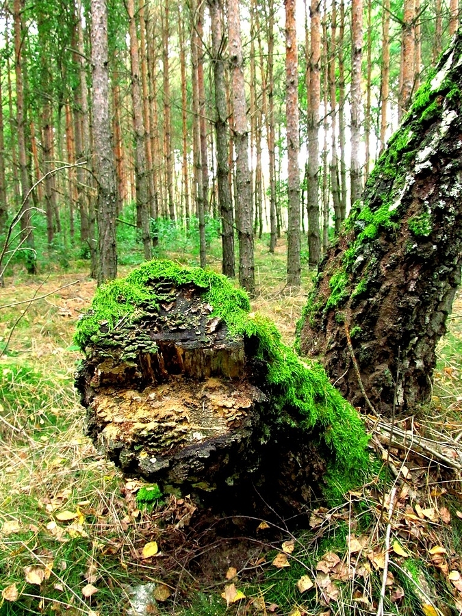 W każdym lesie można natrafić na podobne pieńki drzew, jak ten na załączonej fotografii, które pokryte są zielonym mchem.