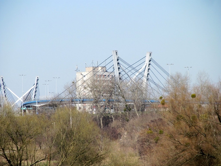 Dwupasmowa estakada nosząca imię inż. Marka Sudaka w Toruniu (na zdjęciu widoczna na pierwszym planie), powstała w związku z budową mostu drogowego im. gen. Elżbiety Zawackiej. W głębi zdjęcia wyłania się fragment przedsiębiorstwa produkującego płatki śniadaniowe Nestle