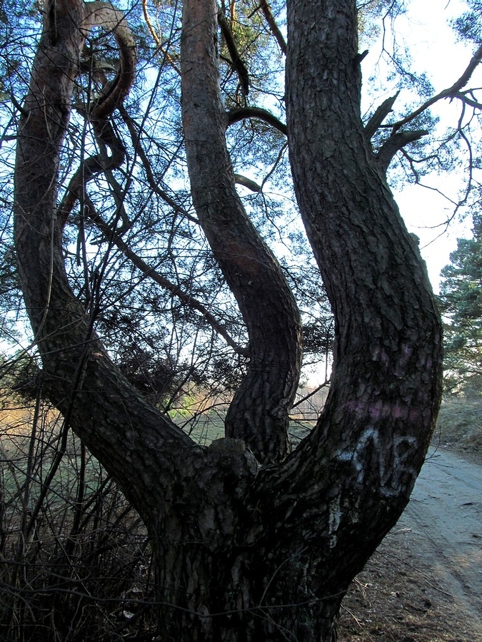 Spacerując po toruńskim lesie, tuż przy leśnej drodze, wyboistej i krętej, natrafiłem na stare, malownicze drzewo z wygiętymi, grubymi konarami. Mając aparat fotograficzny przy sobie nie mogłem przejść obojętnie.