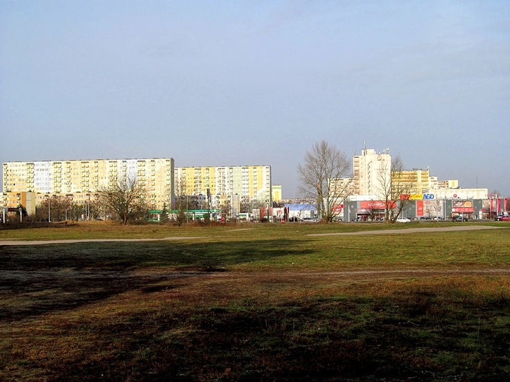 Osiedle RUBINKOWO w Toruniu jest przykładem modernistycznego osiedla o wielorodzinnej zabudowie wielkopłytowej. Na zdjęciu: Środkowy fragment osiedla przy Szosie Lubickiej  głównej arterii wylotowej w kierunku Warszawy (od strony Lubicza) oraz Olsztyna (od strony Grębocina).