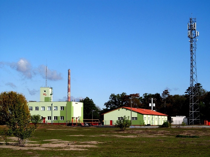 Na zdjęciu: Siedziba Grupy Ratowniczej OSP Toruń-Bielawy, do której należy widoczny przy prawej krawędzi zdjęcia maszt antenowy. Wystający ponad budynek straży biało-czerwony komin, należy do Elektrociepłowni-Grębocin.