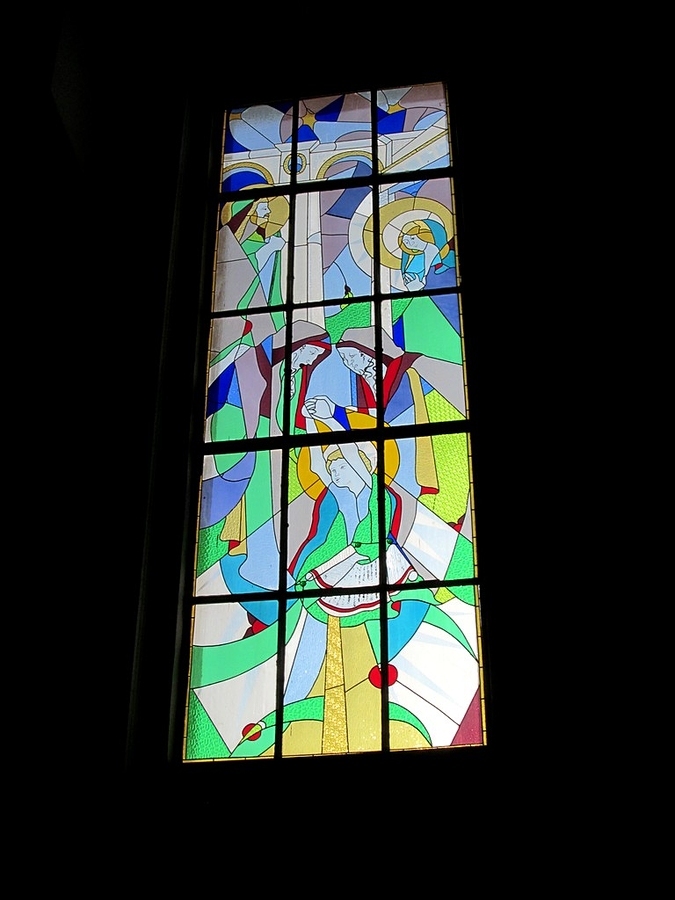 Wnętrze kościoła modernistycznego pw. św. Maksymiliana Kolbego w Toruniu (osiedla NA SKARPIE) z pewnością nieco może rozczarować tego, kto po raz pierwszy wszedł do tej świątyni. I nie ma w tym nic dziwnego, bo sprawia wrażenie, jakby było niedokończone. Jednak, choć tylko częściowo, udało się osiągnąć efekty luministyczne architektowi  Zdzisławowi Klempie, dzięki witrażom sporych rozmiarów, które kontrastują z bielą ścian. Na zdjęciu: Jeden z witraży w kościele św. Kolbego.