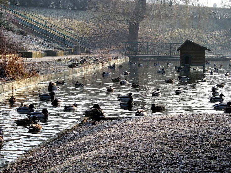W zamglony i oszroniony dzień kaczki w Dolinie Marzeń w Toruniu (na zdjęciu), jak co dzień pływają po wodach płynącej tędy Strugi Toruńskiej. Ten zaciszny zakątek jest nie tylko ulubionym miejscem tego ptactwa wodnego, ale także zakochanych par.
