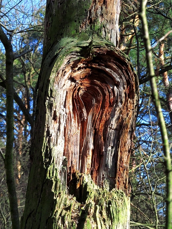 Ta wyrwa w drzewie (na zdjęciu) niewątpliwie spowodowana została odłamaniem się gałęzi od pnia. Gdy ją dostrzegłem natychmiast skojarzyłem sobie z kapliczka zawieszoną na drzewie.