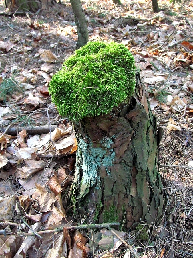 Mech, który pokrył pieniek tylko w miejscu ścięcia drzewa, wygląda, jak zielony berecik nałożony na czyjąś głowę.