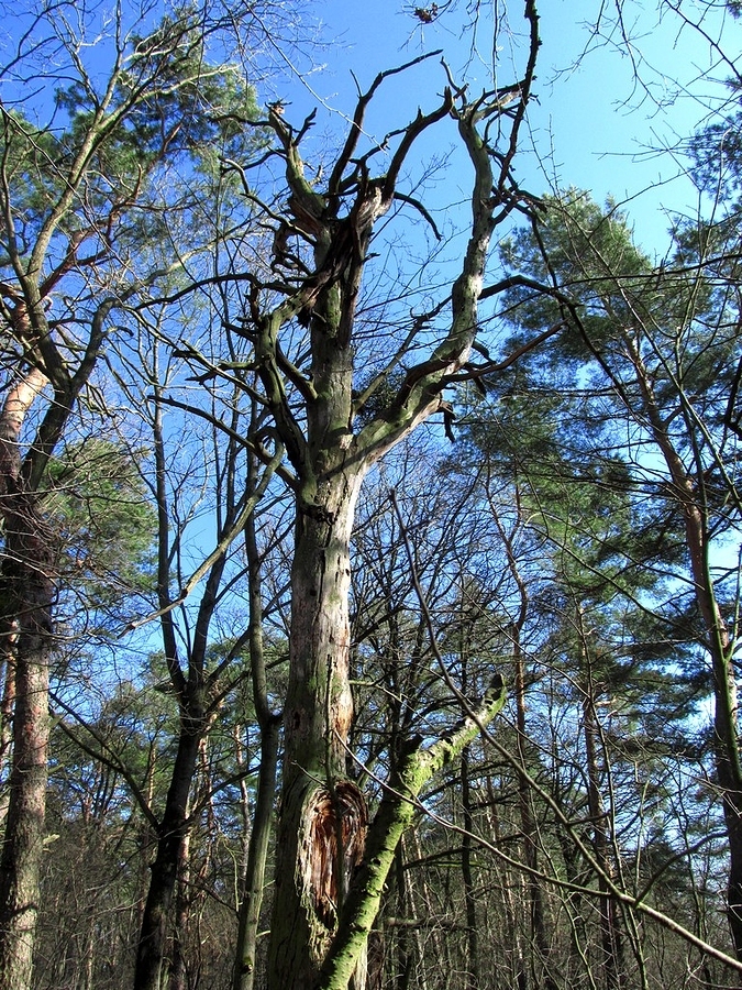 Choć już martwe, nadal stoi w lesie pośród innych żywych, może szpecąc to miejsce, może tworzące ciekawą kompozycję plastyczną? A może jego fragmenty wywołują w człowieku różne skojarzenia, nie zawsze miłe, ale u każdego diametralnie różne.