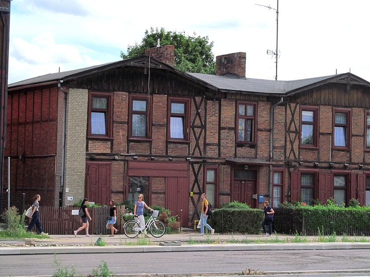 Szkieletowa architektura przemysłowa w Polsce w XIX wieku dominowała w rejonach fortecznych. Toruń jest takim właśnie miastem, więc nic dziwnego, że do dziś można tu jeszcze odnaleźć różne warianty dekoracyjnego ozdabiania w zależności od zastosowanych form. Niektóre domy mają, albo miały ornamenty antykizujące, czego przykładem mógłby być dom mieszkalny z 1885 roku przy obecnej Szosie Chełmińskiej 64 (na zdjęciu), gdyby nie jego przebudowa. Przed jego destrukcją środkowa część budynku była nieco wysunięta i posiadała ozdobną wieżyczkę. Budynek powstał dla mistrza rzeźnickiego Alexanda Wakarecego; obecnie zamieszkuje go kilka rodzin.