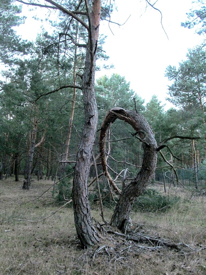 Spacerując po lesie zawsze zwracam uwagę na drzewa, które swoim wyglądem wyróżniają się od pozostałych. I tym razem na taki okaz natrafiłem (na zdjęciu).