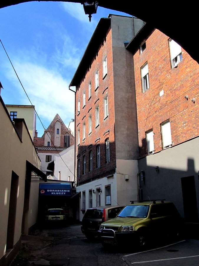 Na starym mieście w Toruniu bardzo często się zdarza, że w bardzo małych podwórkach są niewielkie warsztaciki rzemieślnicze, ale także wejścia do mieszkań przyległych domów. Na zdjęciu: Widok podwórza należącego do kamienicy przy ul. Mostowej 15.