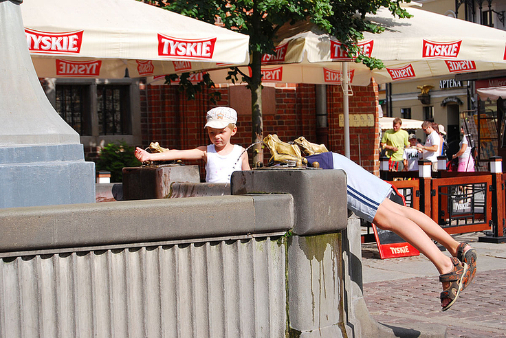 Nurkowanie w fontannie (pomnik flisaka). Toruń