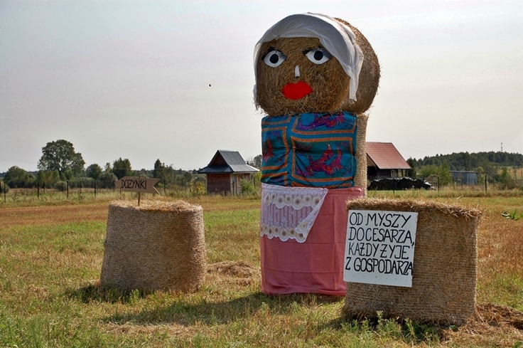 mieszkańcy ustawiają stroiki dożynkowe przed domami