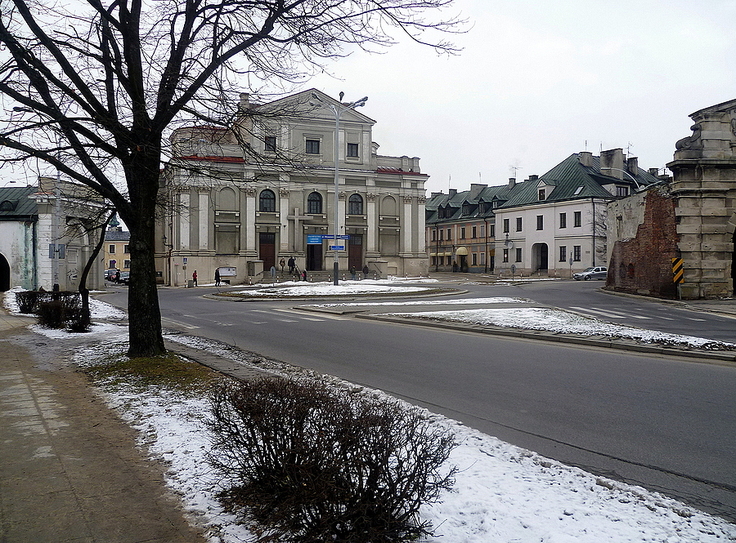Kościół franciszkanów był największą świątynią w Zamościu i jedną z największych w Polsce. Jego budowę rozpoczęto w 1637 r., a pierwszą mszę odprawiono osiemnaście lat później. Fundatorami świątyni byli: II ordynat Tomasz Zamoyski i jego małżonka Katarzyna z Ostrogskich. Po kasacie klasztoru w 1784 r., kościół zamieniono na magazyn wojskowy, a w 1840 r. przebudowano na koszary. Po 1918 r. w gmachu ulokowano różne instytucje m.in. muzeum i kinoteatr Stylowy. W latach powojennych część pomieszczeń przeznaczono na Państwowe Liceum Sztuk Plastycznych. Począwszy od lat międzywojennych Kościół czynił starania o odzyskanie świątyni, w wyniku których w 1993 r., po dwustu latach, Franciszkanie wrócili w jej mury. XIX-wieczne przebudowy znacznie zubożyły budowlę, ale zachowane elementy kamieniarskie, a zwłaszcza korynckie pilastry i barokowy portal na zachodniej ścianie (dawniej główne wejście), przypominają o jej dawnej świetności. (http://www.turystyka.zamosc.pl/pl/page/314/kosciol-franciszkanow.html)