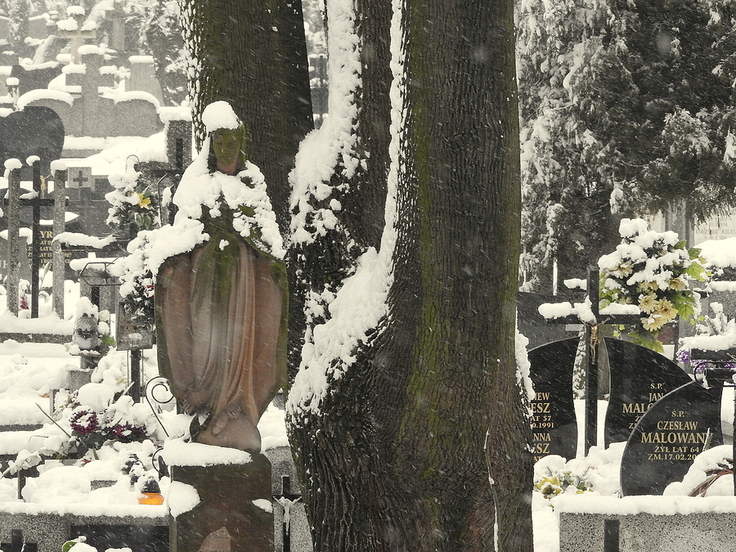 Ładnie wyglądają pomniki i nagrobne figury w śnieżnym okryciu :)
