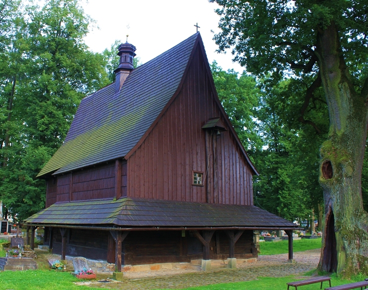 Lipnicki kościółek jest jednym z najsławniejszych zabytków Małopolski. Powstał pod koniec XV w., choć tutejsza tradycja łączy go z rokiem 1141, kiedy na miejscu gontyny (pogańskiej świątyni) miał stanąć właśnie ów obiekt. Dowodem na prawdziwość tych barwnych podań ma być podpierający od tyłu ołtarz główny tzw. słup Światowida, rzekomo z wizerunkiem słowiańskiego bożka. Kościół został wpisany na Listę UNECO w 2003 r. Dziś niewielka, bezwieżowa bryła kościoła pięknie wpisuje się w krajobraz. Strzegą jej potężne drzewa, wokół których przetrwały cmentarne mogiły. Sam kościół dotrwał do naszych czasów prawie w niezmienionym stanie, zachowując archaiczną gotycką sylwetkę. W XVII w. otoczono go jedynie sobotami (parterowymi podcieniami), a w XIX w. dodano portal zachodni. Otwarte soboty, nadające bryle tyle uroku, oprócz swych zwyczajowych funkcji (ochrony podmurówki przed zawilgoceniem i dawania schronienia pielgrzymom) służyły także do przechowywania trumien, nim złożono je do grobów na przykościelnym cmentarzu. Ten stary cmentarz, założony w 1711 r., dziś też wygląda bardzo malowniczo; zachowało się na nim wiele cennych nagrobków z XIX w. Trudno nie zachwycić się wnętrzem kościółka: ascetycznym i pełnym szlachetności. Niewielkie okienka skąpo doświetlają pomieszczenia, a panujący tu półmrok sprzyja kontemplacji. W tak surowym, ubogim wnętrzu niezwykłe wrażenie robią polichromie ornamentalne i figuralne szczelnie pokrywające ściany i powały. Najstarsza dekoracja, stropów w prezbiterium (koniec XV w.) i w nawie (XVI w.), została wykonana za pomocą szablonów: motywy roślinne są w odcieniach zieleni, brązu, żółci i błękitu. Polichromie na ścianach prezbiterium pochodzą z XVII w., a w nawie z XVIII stulecia i przedstawiają różnorodne sceny z życia religijnego. Polichromowany jest również parapet chóru, na którym ludowe malowidła ilustrują Dziesięć Przykazań. Do niedawna wnętrze kościoła zdobiły trzy niezwykle cenne gotyckie ołtarze (z XV i XVI w.), które jednak skradziono. Kiedy udało się je odzyskać, umieszczono je w Muzeum Diecezjalnym w Tarnowie, w świątyni natomiast znalazły się ich kopie. Z wystroju wyróżnia się też malowana barokowa ambona z wyobrażeniami czterech ewangelistów. Kamienna płyta na środku nawy to wejście do zniszczonej przez powódź w 1997 r. krypty grobowej Józefiny i Antoniego Ledóchowskich, rodziców błogosławionej Marii Teresy i świętej Urszuli. W świątyni znajduje się też cenny pozytyw szkatulny skrzynkowy instrument organowy, jeden z zaledwie siedmiu tego rodzaju w Polsce.