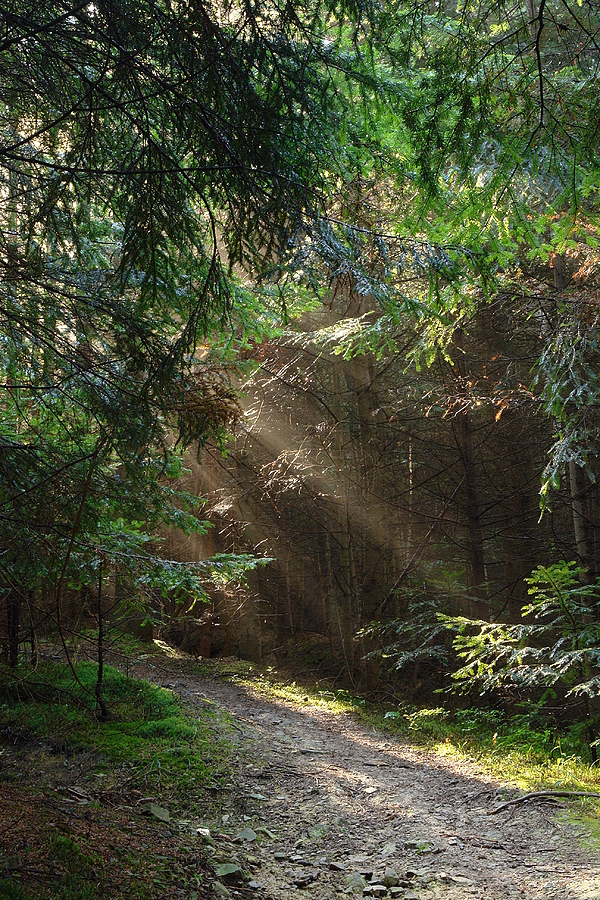 Skry potu roszą nasze czoła. Dają o sobie znać stare kontuzje. Ciężko jest oddychać. Parno i duszno. Dziewczyny dostały fory. Ciekawe, czy je dogonimy. Może nie zostawią nas samych w lesie. Wiadomo, w razie niebezpieczeństwa, kobiety biorą je na siebie, a dzielni mężczyźni biegną po pomoc! Kolega podaje mi statyw i czeka, aż skończę manipulować tymi wszystkimi śrubkami, korbkami i pokrętłami przy aparacie. Samowyzwalacz i 10 sekund odpoczynku. Potem jeszcze kilka ujęć. Przez unoszący się leniwie opar przebijają się promienie słońca. Zaraz odpoczniemy, wygrzejemy się na gorczańskich polanach. Składam bambetle i oddaję statyw koledze. Nie ma to jak pomocny towarzysz! Przez gorczańskie lasy wspinamy się dalej.