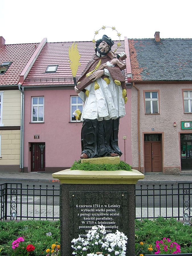 Figura Jana znajduje się na rynku na placu Narutowicza. Jan z palmą i krucyfiksem oraz aureolą z sześcioma gwiazdami.